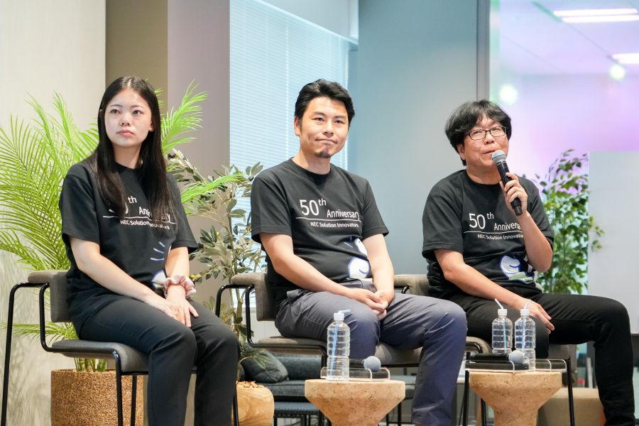 現役の名越は1990年代のダイヤルアップ接続の頃を懐かしみます。子育てと仕事を両立しながら、NECソリューションイノベータに統合前の各地のエリア会社のメンバーと連携し、プロジェクトを進めた経験を披露しました。さらに、技術が大きく進化する中で、ガラケーからスマートフォンへの転換期には、スマートウォッチとの連携やドローン映像解析など、新たな応用にも果敢に挑戦。「仲間とともに臆せず前に進み続ける風土があった」と笑顔を見せました。