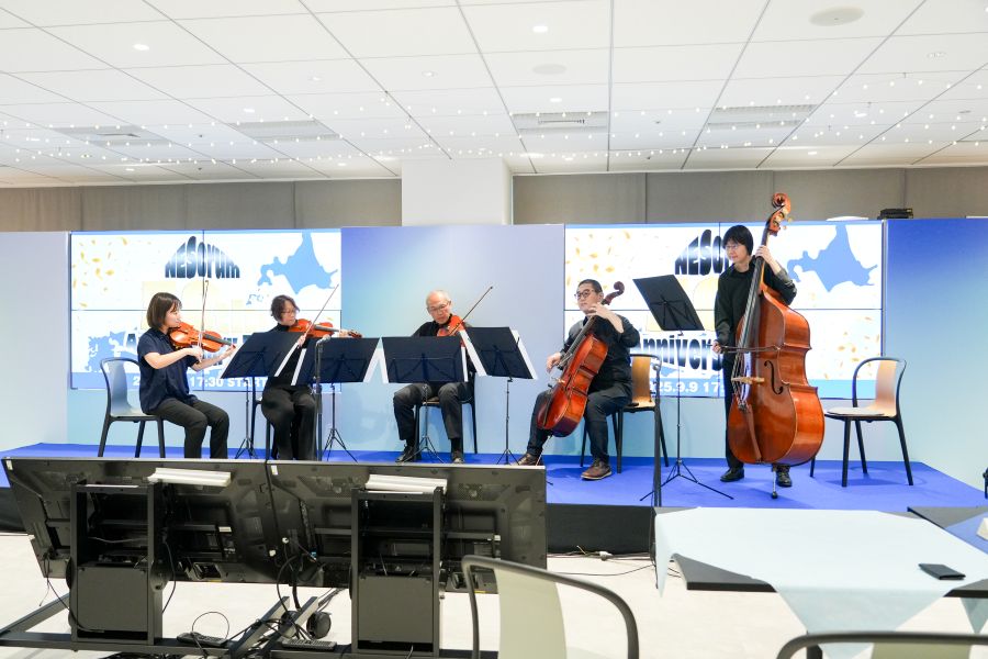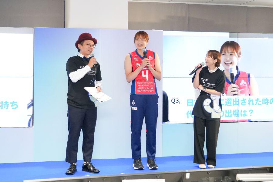 東京の本社会場ではNECソリューションイノベータ管弦楽団の弦楽アンサンブルが響き渡り、華やかに幕が開きました。各拠点ではケータリング料理を囲んで談笑が弾み、豪華景品が当たるクイズ大会も開催。当社所属のNECレッドロケッツ川崎の選手・廣田あいも登場し、会場をさらに盛り上げました。