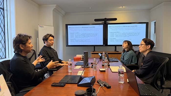 もちろん、この取り組みは帰国したら終わりではありません。現地で得た知見や刺激を自身の業務や働き方に取り入れたり、部署の仲間たちと共有したりする取り組みが始まっています。 11月に行われた社長タウンホールミーティングでは、3人が登壇し、岩井や今回の訪問を現地でサポートしたNEC Corporation of Americaの市川大輔(NECソリューションイノベータより出向)と共に、全社向けに簡単な報告を行いました。