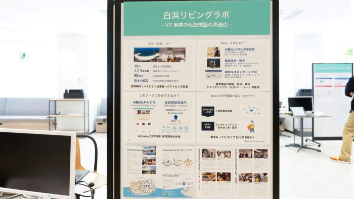 イノベラボDAYの展示では、チャットで指示を入力すると、Web用の紹介ページ(LP)を自動生成するAIエージェントのデモが紹介されました。Web分析からコンテンツ・画像・HTML生成までを自動化する仕組みは、AIを前提に設計する「AIネイティブ」な事業開発の象徴的な事例です。