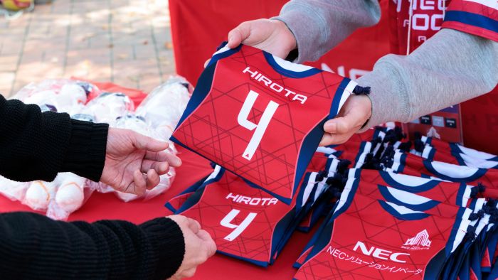 「会場全体で一体感を持って応援したいという事務局の思いのもと、たくさんの社員の方々にご来場いただけたのが本当に心強かったですね。会場中央に設置された大型ビジョンでは、試合前や試合中に企業PVを再生し、応援用ハリセンにはNECソリューションイノベータのロゴを入れています。こうした接点を通じて、『NECソリューションイノベータって何をしている会社なんだろう?』と興味を持っていただくきっかけになればと考えました。また、当日限定のオリジナル巾着を製作・配布できたことも、チームとして喜ばしく感じています。今後もレッドロケッツとの絆を感じていただけるとうれしいです」(澤)