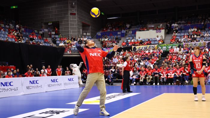 そうした中、NECソリューションイノベータ協賛のもと行われたスペシャルマッチ(VS 東レアローズ滋賀)は、レギュラーシーズン自力優勝がかかった天王山の一戦。待ちに待った瞬間を見逃すまいと、多くのクルーがアリーナに詰めかけ、会場をチームカラーの赤で見事に染め上げました。