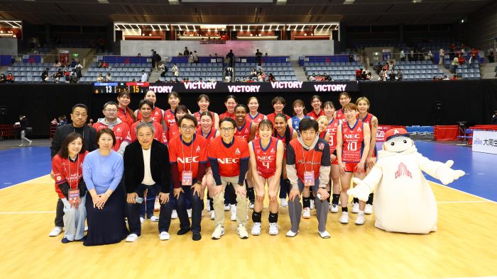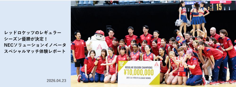 2026年3月29日(日)、東急ドレッセとどろきアリーナ(川崎市)で、大同生命SV.LEAGUE(以下、SVリーグ)『〜AIネイティブカンパニーへ〜 NECソリューションイノベータ スペシャルマッチ(以下、スペシャルマッチ)』が開催されました。この日、NECグループの女子バレーボールチーム「NECレッドロケッツ川崎(以下、レッドロケッツ)」が、待望のレギュラーシーズン優勝を決めました。本記事では、記念すべき一日の会場の様子と、NECグループの技術がもたらした新たな観戦体験、その後の戦いについて紹介します。