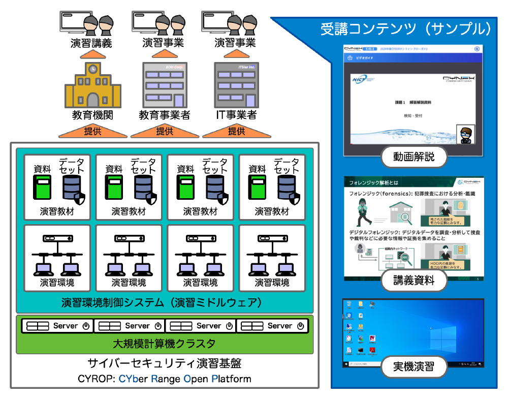 この状況を受けてNICTは2021年、「サイバーセキュリティネクサス(CYNEX)」を設立し、2022年には膨大なデータや知見を活用したサイバーセキュリティ人材を育成する共通基盤を提供開始。サイバー演習基盤『CYROP』は、教材や実機環境を柔軟に利用できる仕組みとして整備されました。