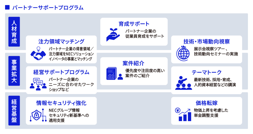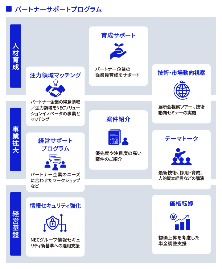 NECソリューションイノベータでは、約1,300社のパートナー企業とともに、サプライチェーン全体の最適化を通じて新たな共創と協働を推進するため、『パートナーサポートプログラム』を展開しています。『パートナーサポートプログラム』は、人材育成や事業拡大、経営基盤の強化を軸に得意領域のマッチングやトークセッションなど8つの支援プログラムを整備しています。企業の利益と個人の成長を両輪とし、社員だけではなくパートナー企業の従業員にも自己成長の機会を提供し、サプライチェーン全体の価値向上をはかっています。プログラムでは、パートナー企業との双方向の対話を重視し、パートナー企業のニーズや課題をデータベース化。各社の課題に寄り添い、最適な支援の組み合わせを提案・展開しています。