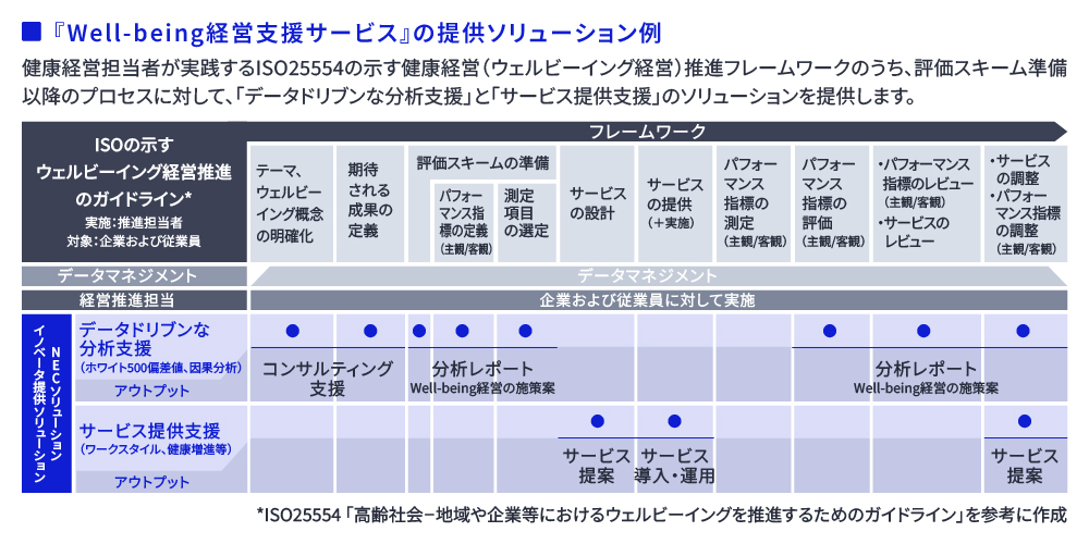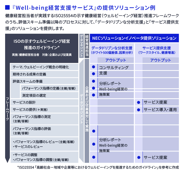 また、そうしたノウハウをコンサルティングとして企業に提供する取り組みを進めることで、社会全体のWell-being向上に寄与することを目指しています。2024年11月、ISO(国際標準化機構)がISO25554を発行し「高齢社会-地域や企業等におけるウェルビーイングを推進するためのガイドライン」の提供を開始しました。このガイドラインは世界的な高齢化の進行と、それに伴う社会的課題に対応するために日本からの提案により発行された国際規格です。NECソリューションイノベータの『Well-being経営支援サービス』は、このISOのガイドラインに沿った取り組みであり、世界的な社会課題の解決に資するものといえます。