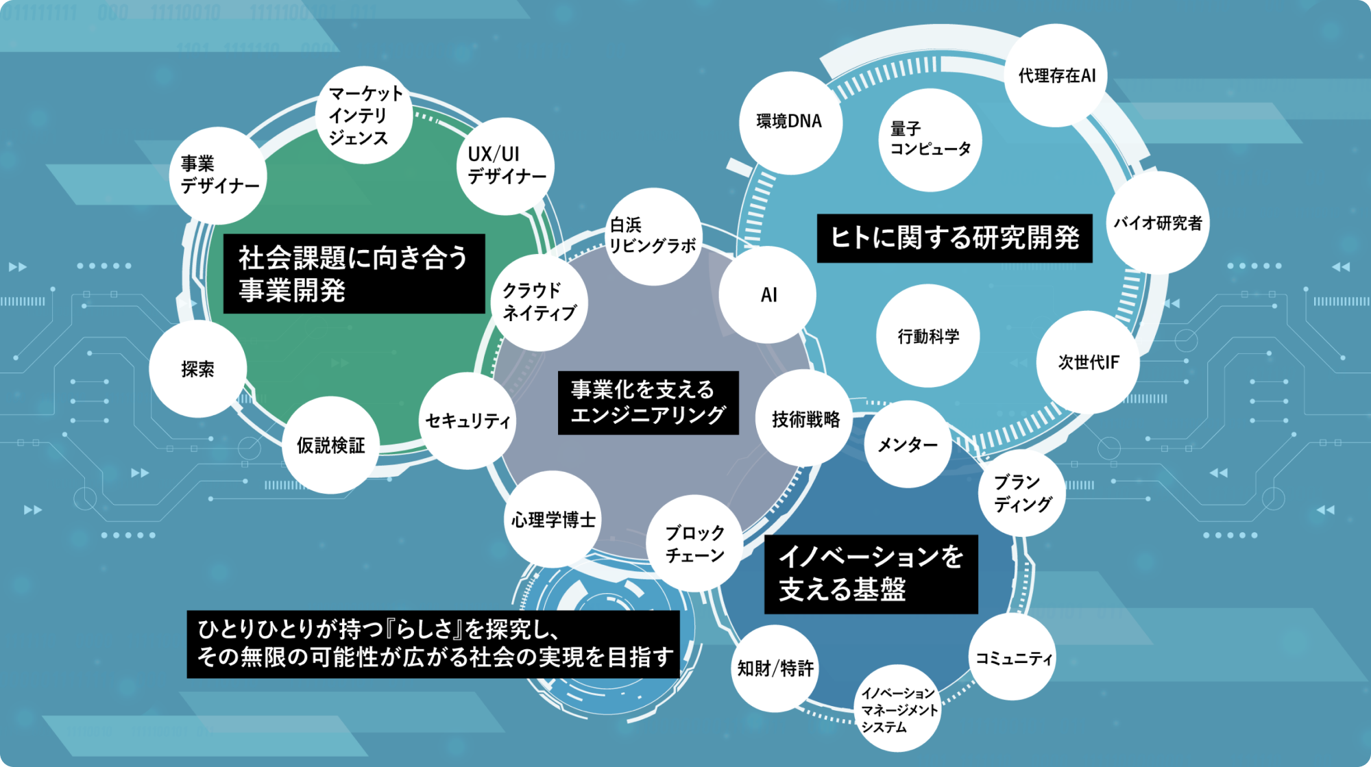 イノベーションラボラトリの研究者たちは、ヒトを深く探る。 事業開発者たちは、社会の明日に向けて問いを立てる。 異なる視点が交わるとき、ウェルビーイングという未来の仮説が生まれる。 私たちが描くのは、人が健やかに生き、心豊かに働き、社会と自然が調和する未来。 その実現に向けて、私たちは問いを投げかけ、仲間を集め、社会を動かしていく。