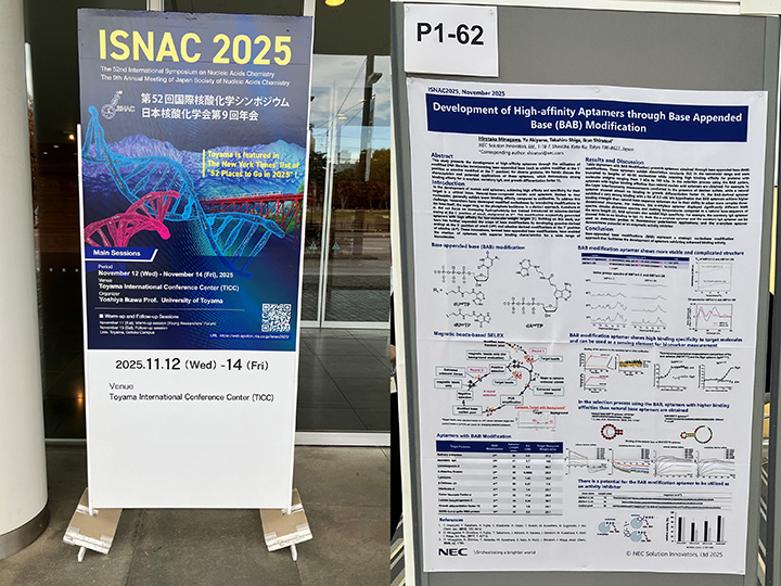 イノベーションラボラトリ サイエンスラボ第2のバイオセンシンググループでは核酸アプタマー及びアプタマーを用いた検出法の研究開発を行っています。11月12日(水)~11月14日(金)に富山国際会議場で開催された日本核酸化学会第9回年会および第52回国際核酸化学シンポジウム(ISNAC2025)でこれまで我々が開発した核酸アプタマーについて発表を行いました。