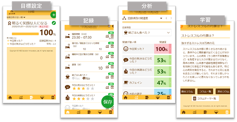 日々の記録だけでなく、心理学に関する知識提供、目標設定、記録の振り返りや分析の機能を搭載しています。ただ記録するだけでなく、効果的に記録し、それらを活用するためのアプリです。