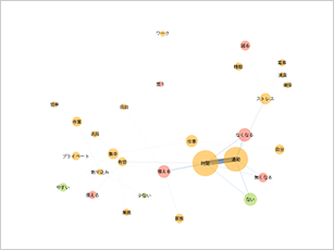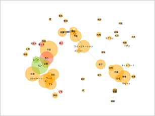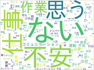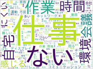 在宅勤務が急に決定したため、多くの人が準備できないままテレワークに突入しました。そこでは、準備不足のために困ったことや実施してみたら意外と良かったことがあったと考えられます。しかし、これらは個人宅の環境に依存しているため、選択式のアンケートで聞くには限界があります。そこで、テレワーク環境について質問(テレワークで困ったこと・良かったこと・不安なことなど)を記述式で回答してもらいました。記述されたテキストの単語についての頻度分析と共起分析を行い、テレワーク環境に対するメリット・デメリットを分析しました。
