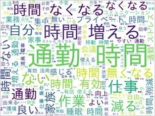 大半の人にとって、テレワークを実施してよかったことは、通勤時間が減ったことです。一方で、プライベートの時間が増えたため、分析結果からは「時間が増えた」「時間が減った」の二面性が見られます