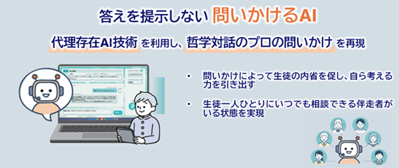 今回私たちが紹介した答えを出さないAIは、高校で必修化された「総合的な探究の時間」の現場での活用を想定しています。