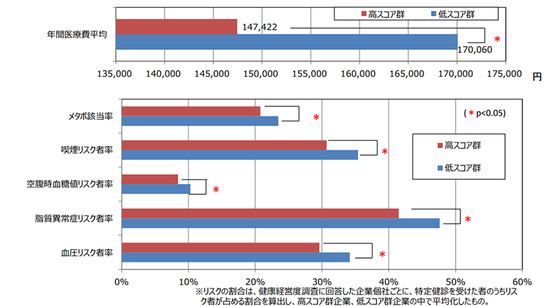 東京大学等が土木建築業種の大企業23社に対し行なった健康経営に関する調査(以下に参照画像あり)では、緊急性が高いところほど、年間医療費平均やメタボ該当率における低スコア群の割合が高スコア群よりも高くなっている傾向があると判明しています。そのため、企業は低スコア群が高スコア群を上回らないような健康管理を従業員に対して施していくことが求められるでしょう。