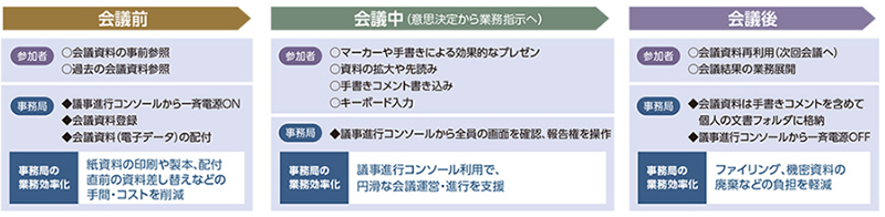 また、これら2つの取り組みは、IT活用による「ペーパーレス会議の実現」が有効となってきます。ペーパーレス会議を導入することで、会議のために出社するといった負担が減りますし、テレワーク中でも円滑なコミュニケーションを図ることが可能です。