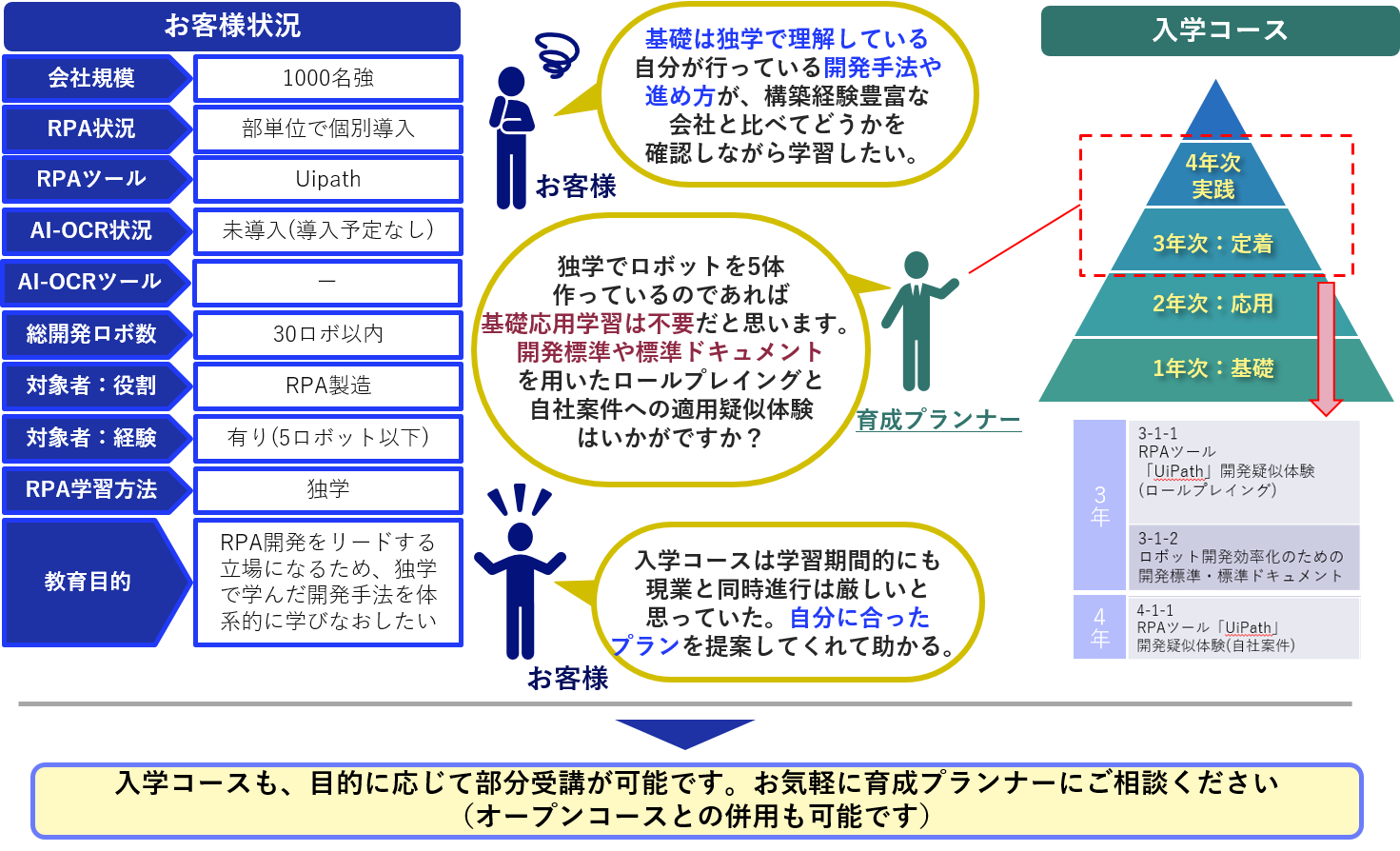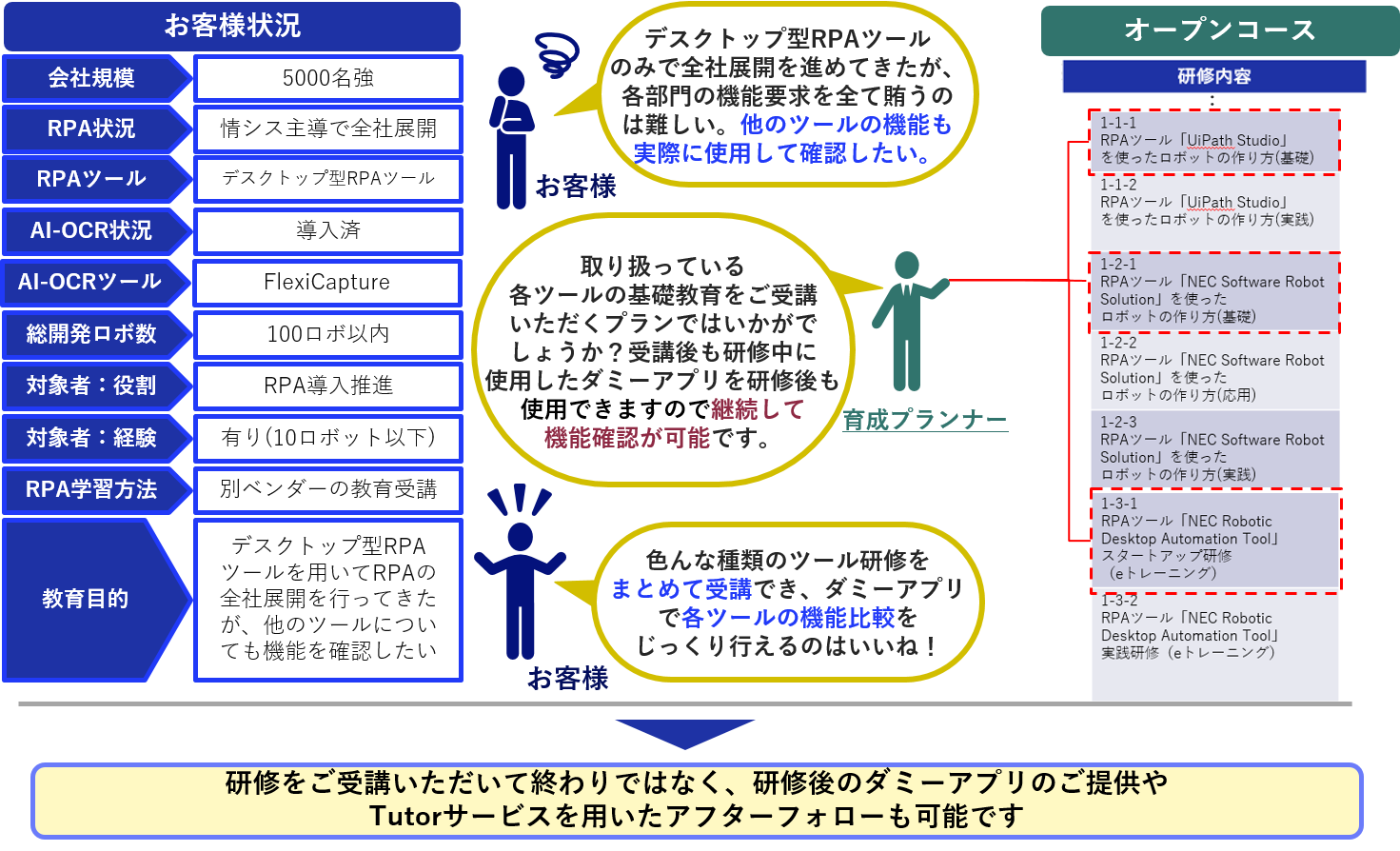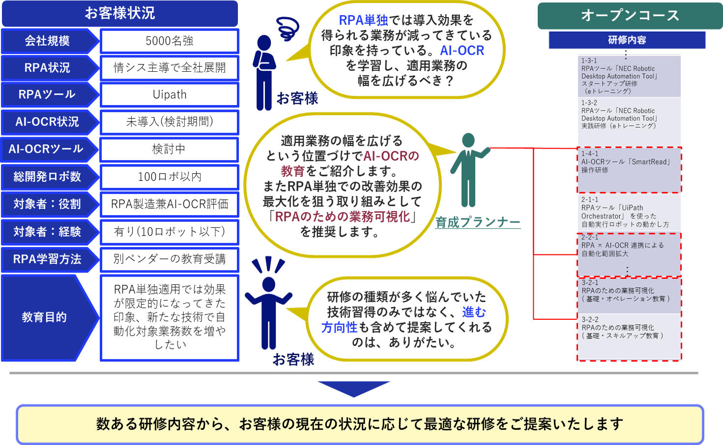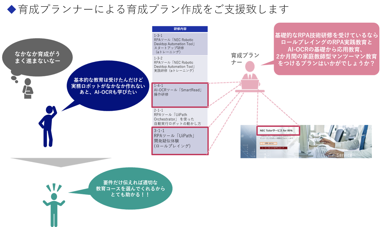 NEC カレッジ for デジタルレイバーの育成プランナーとは、お客様の育成のご要望をお伺いし、その要件にあった育成プランをご提案させていただくRPA研修のプランナーのことです。