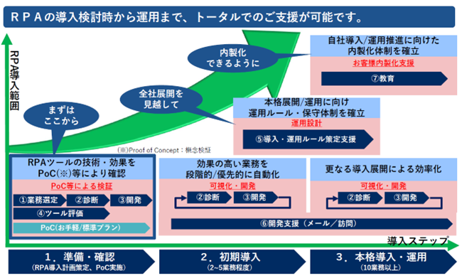 NECでは、RPAの導入検討から運用までをトータル支援する環境・ソリューションが揃っています。自動化対象の業務選定や費用対効果算出といった導入時の悩み解決から、運用ルール・保守体制の確立、運用推進に向けた内製化体制の確立まで、一気通貫にサポート可能です。ここからはどのようなサービスがあるのか、各支援内容について紹介します。