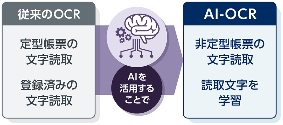 従来のOCR(光学文字認識)は、定型帳票の事前登録された文字情報を読み取るだけでしたが、AIで読取対象画像を学習することで、非定型帳票の手書き文字も読み取りが可能です。