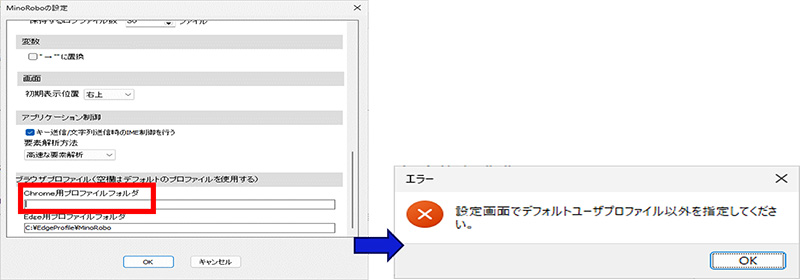 この現象に対応するため、設定画面でChrome用プロファイルフォルダが設定されていない場合(ブランクの場合)、Chromeを制御する際に、「設定画面でデフォルトユーザープロファイル以外のプロファイルを指定してください」というエラーメッセージが表示されるようになりました。