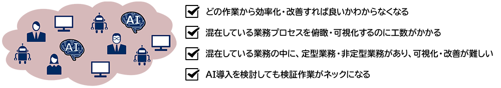 様々な業務プロセスを改善する場合、RPAやAIなどの登場により、RPA、AI、システム、そして人の作業が「混在」し、その結果全体の可視化が煩雑になり、以下のような課題が発生する懸念があります。