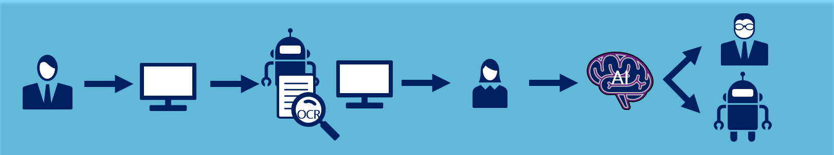下記の図のように、RPA、AI、システム、そして人の作業を問わず、プロセス全体の流れが見える化されている状態を作り上げることが理想です。