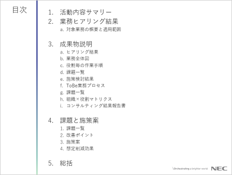 NEC 業務プロセスコンサルサービスは、業務プロセスの可視化、改善ポイントの導出、改善プロセスの策定まで行うサービスです。