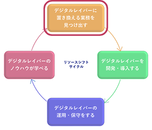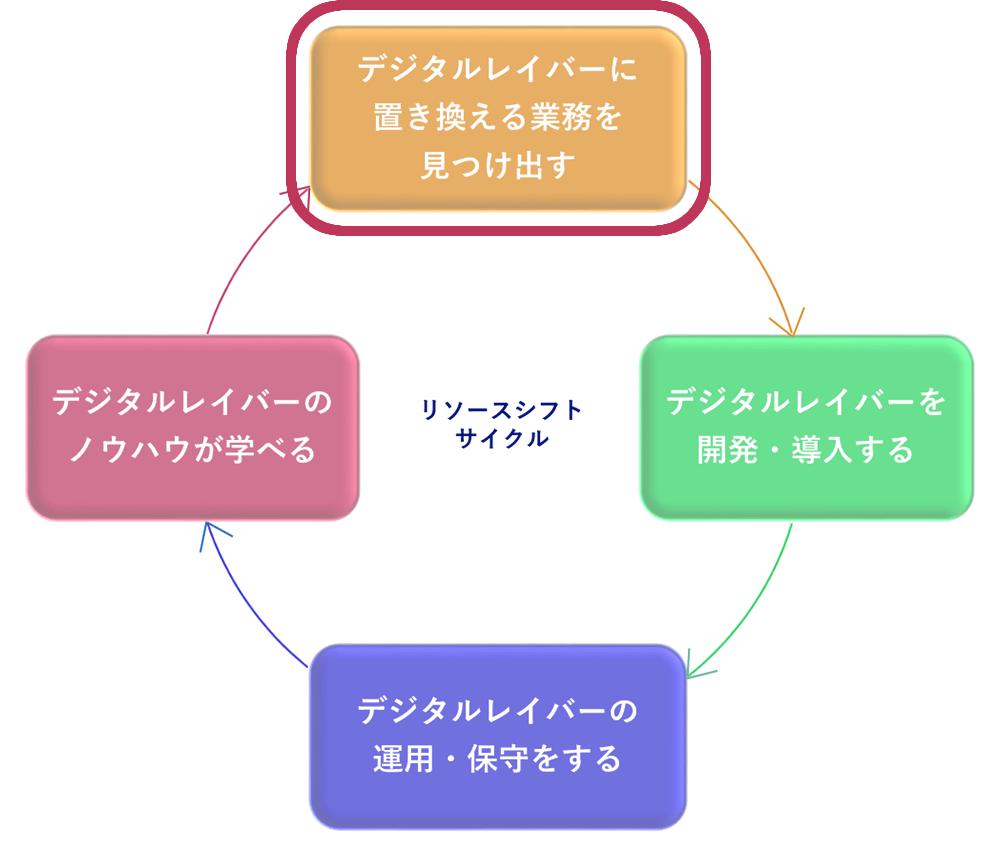 左のリソースシフトサイクルにおいて、「デジタルレイバーに置き換える業務を見つけ出す」の段階では、デジタルレイバーに置き換えることができる「人間がおこなっている業務」を見つけ出します。そのために、弊社では、下記のようなご支援をご用意しております。