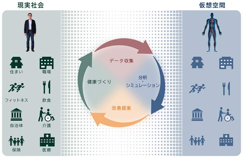 人の健康状態と取り巻く環境をデジタル化し、仮想空間に再現。ICT・AI・バイオ技術で分析・シミュレーションし、その人の状態やライフスタイルに合わせた健康づくりにつながるご提案で、行動変容を促します。さらに成果を見える形で示すことでモチベーションをより向上し、好循環を作り出していきます。