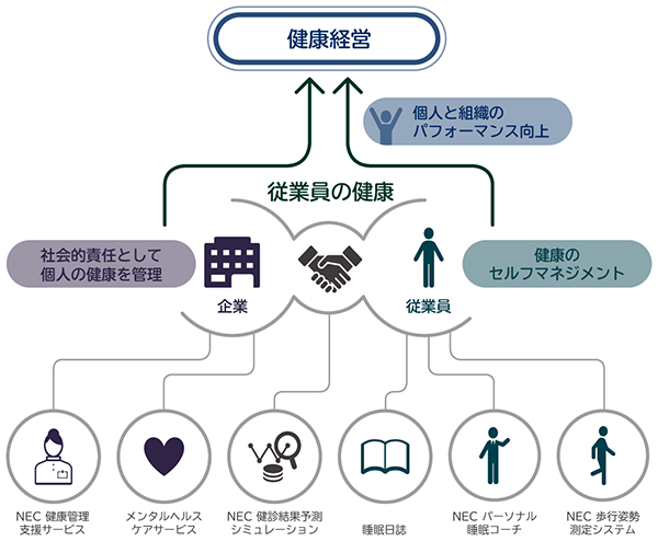 企業が社会的責任として従業員の健康を管理するための仕組みと、従業員一人ひとりが自らの健康のセルフマネジメントをしやすくするための仕組み、そしてそれらをつなぐ仕組みを提供することで、働く人の健康を増進し、誰もが活き活きと働き続けることで企業の業績向上につなげていく、健康経営の取り組みを支えます。