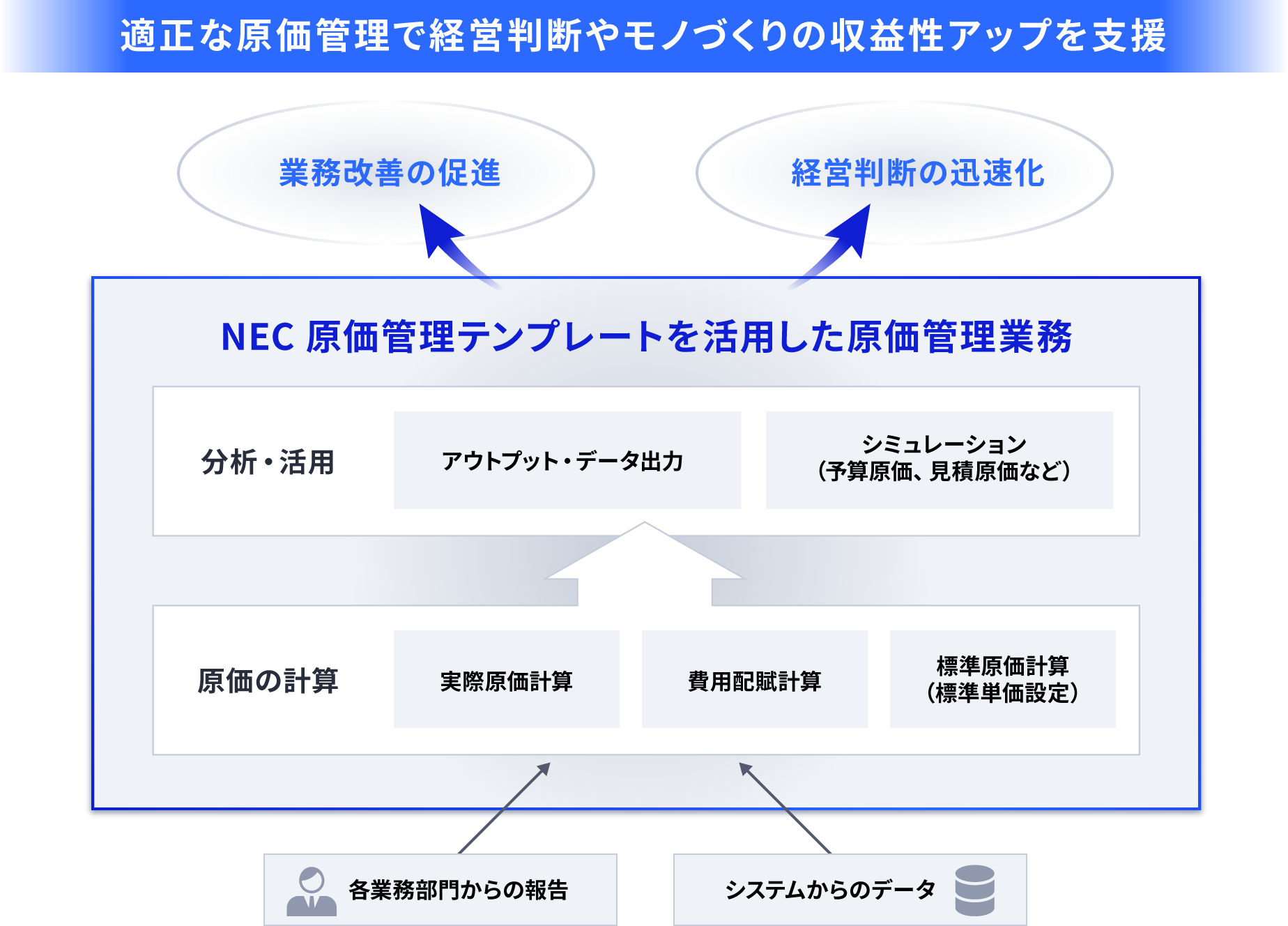 原価シミュレーションや配賦処理など、製造業の原価管理に必須の機能を標準搭載。NECグループの原価管理システム導入事例をベースに、最適な原価計算機能をテンプレート化しているため、業務改善を効率的に進められます。