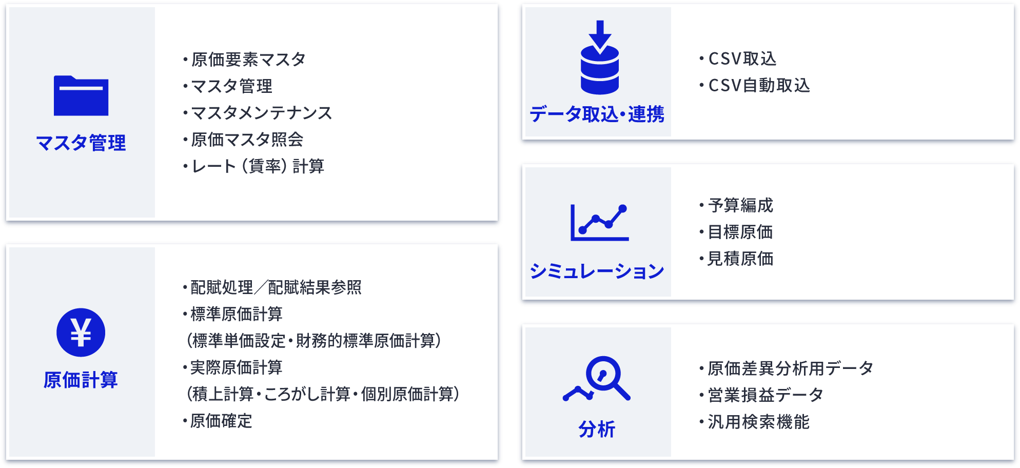データの収集から計算・分析まで、製造業の原価管理業務を幅広くカバーする豊富な機能を備えています。