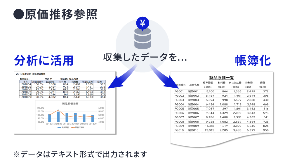 原価管理に欠かせない機能を備え、データの収集・集計・分析を標準化することで、経営判断に活かせる原価管理の仕組みを構築します。
