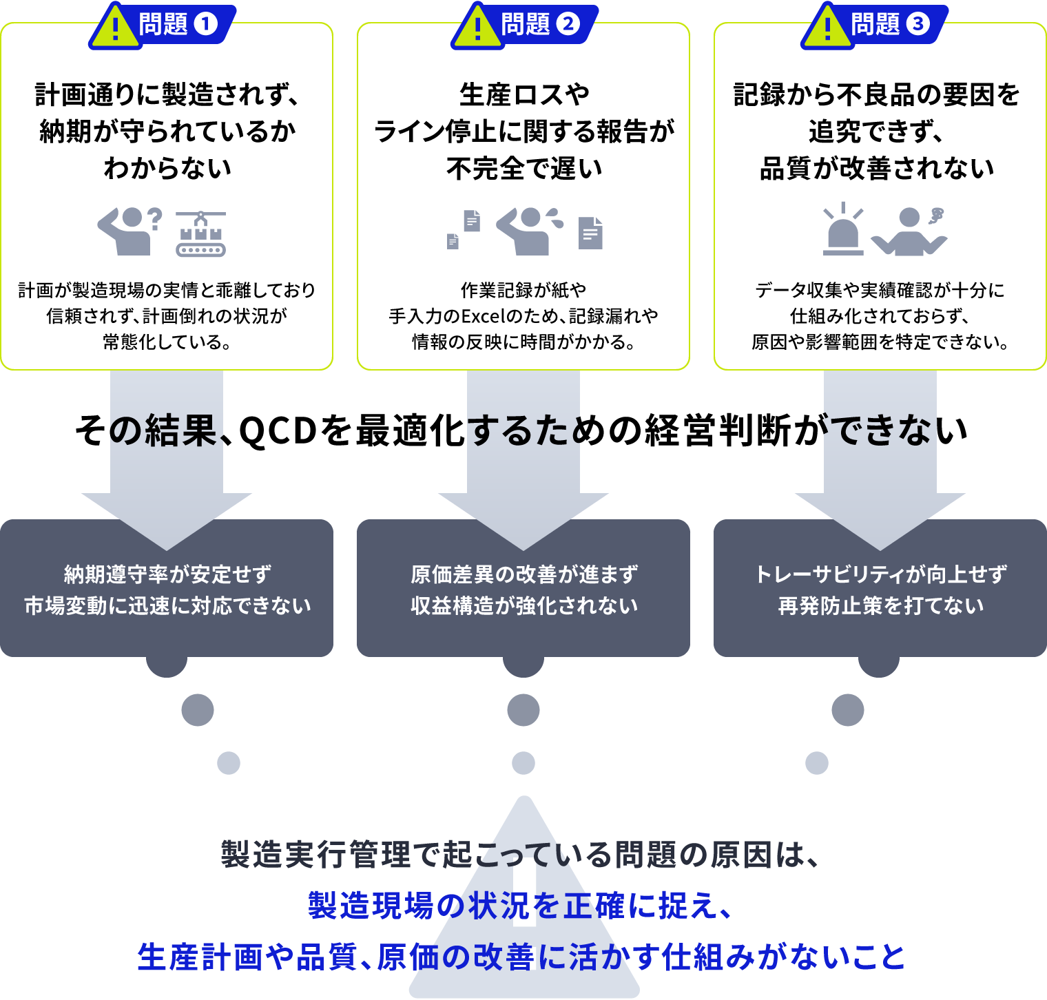 製造実行管理では、計画通りの進捗管理や製造・品質の確認など、QCDに関するさまざまな課題が発生しています。
