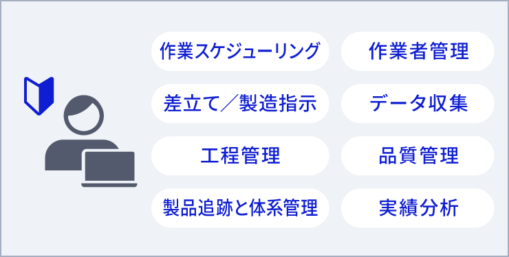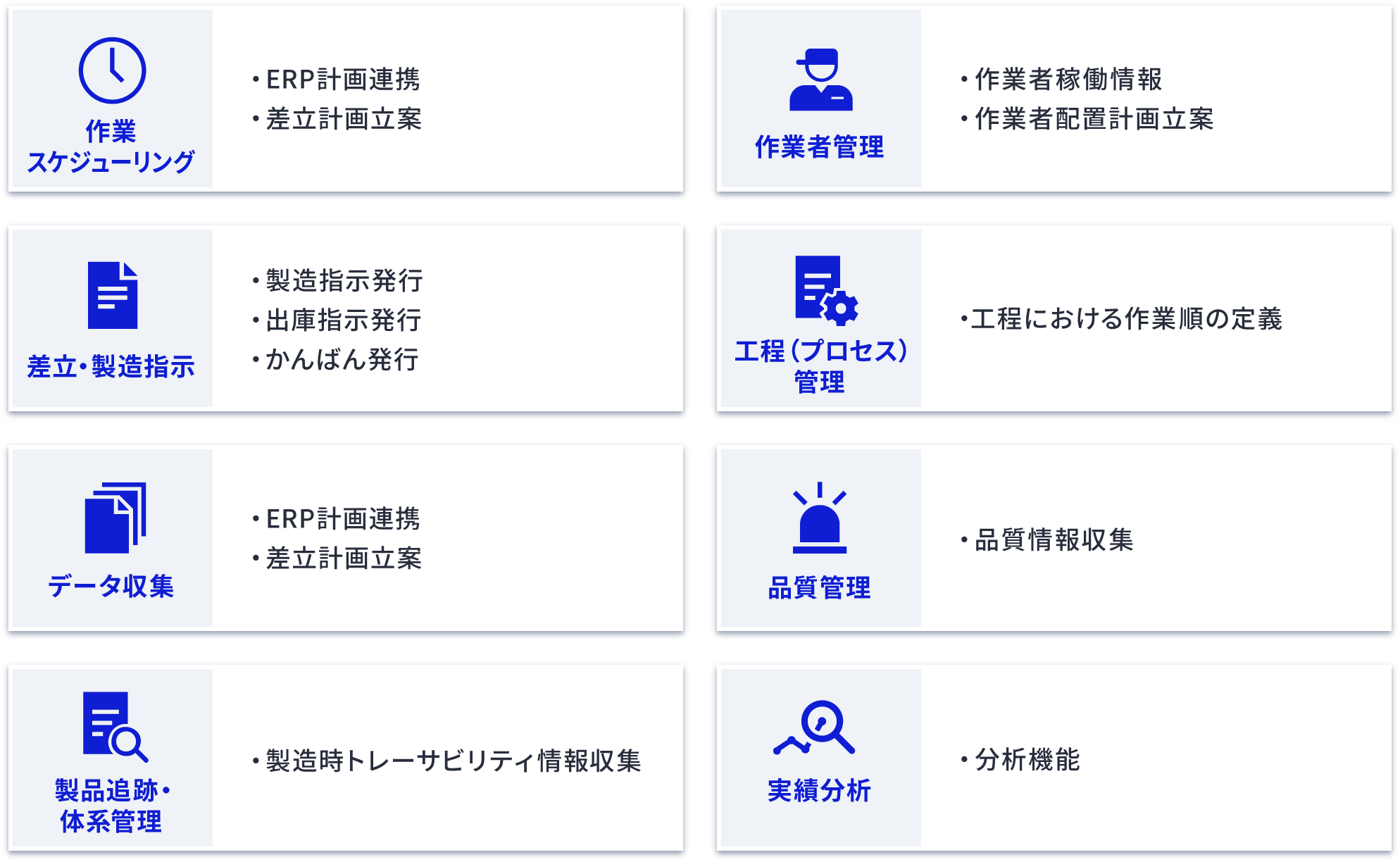 製造指示や品質・工程・作業者管理など、製造実行管理に必要な主要業務をMES※注で一元管理できる機能を揃えています。