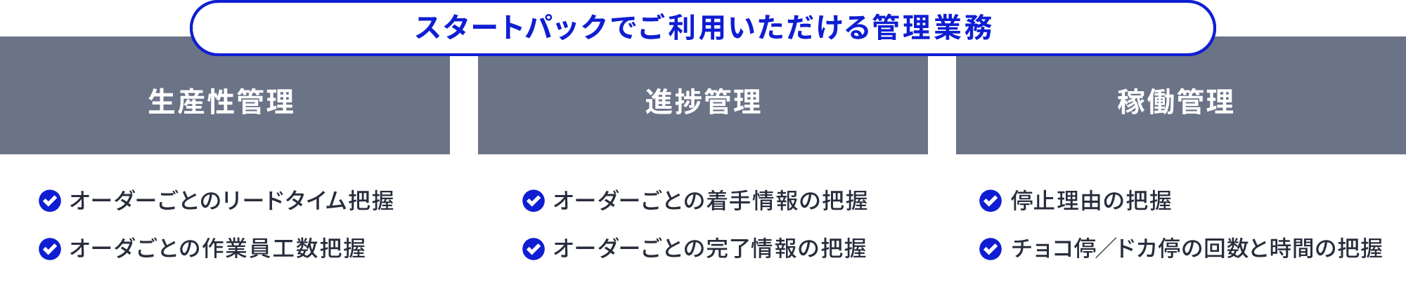 ノンカスタマイズでの導入で、本ソリューションの一部機能を先行利用しながら効果を実感いただけます。機能を厳選して導入することで、低予算かつスピーディーなMES※注導入が可能に。管理レベルが容易な業務からスモールスタートでお試しできます。
