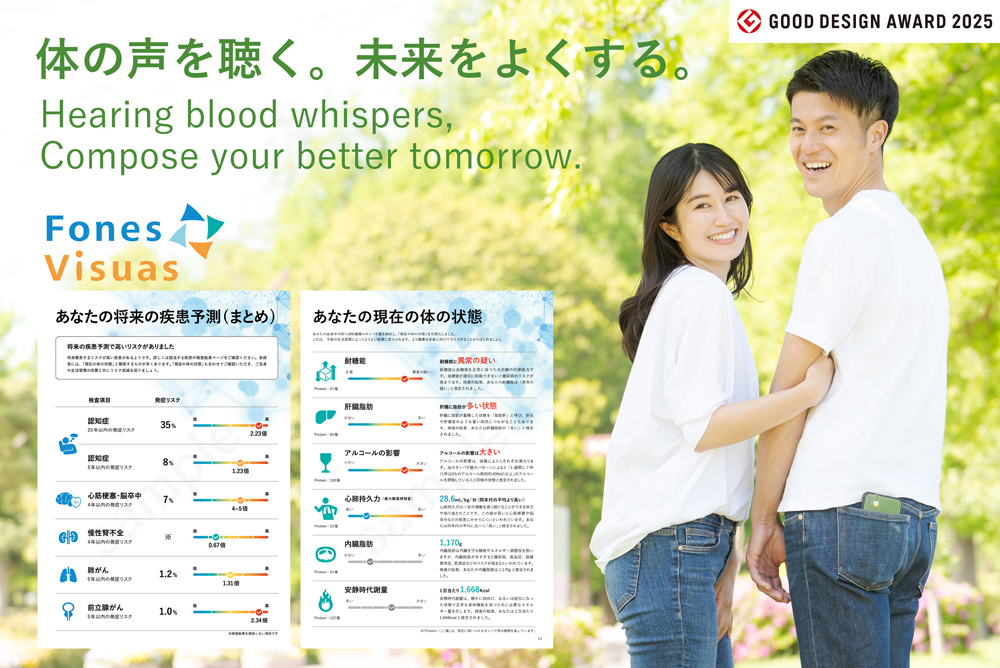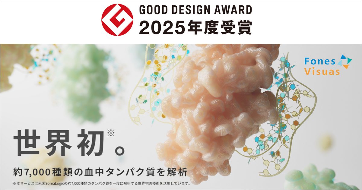 少量の血液(注1)から約 7,000 種類のタンパク質を一度に解析する世界初(注2)の技術を活用し、「将来の疾病リスク」と「現在の体の状態」を可視化する疾病リスク予測検査「フォーネスビジュアス」(注3)が、暮らしや社会をよりよくしていくデザインに対して与えられる「2025年度グッドデザイン賞(主催:公益財団法人日本デザイン振興会)」を受賞しました。
